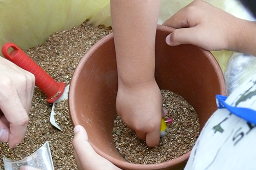 見たこともないおかしなタネを植木鉢に植えて、みんなのアイディアを注ぐと、どんな芽がでる?どんな花がさく?みんなで新しい植物を考えよう。