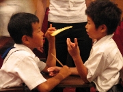 | 説明 | 立命館小学校でCAMPデジカみしばいワークショップを開催しました。 ひとコマずつ違うグループがお話を考える、「連歌」形式で5コマのお話をつくっていきます。お話ができたら、人形や小道具、背景を組み合わせて、デジタルカメラでパシャリ。どんなお話ができるかな? |