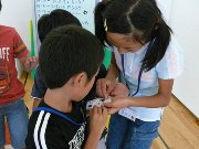 せなかのシールが同じ色の人がいっしょのチームだよ。口を聞かないで色を教えてあげるには・・・? - 【6.サンプルしょうかい】