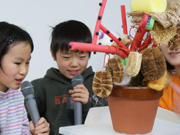 みんなが考えたふしぎなしょくぶつのもけいづくり。2人で協力してつくろう。