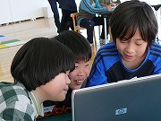 3人で協力しながら、プログラムをつくっているよ。「次は、どんなセリフにしよう?」 - 【9.サンプルしょうかい】
