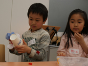そざいの説明を聞きながら、「あ、あれ使おうよ」「あれも使えるね!」って、早速グループで相談を始めていました。