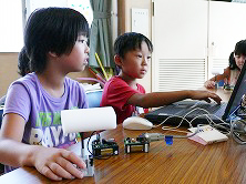 | 説明 | コンピューター「クリケット」とモーターやセンサー、スピーカー、約200種類のいろいろな素材にみんなのアイディアを組み合わせて、プログラムで動くおもちゃをつくろう。2人1組で協力しながら、動きはパソコンでかんたんにつくれるよ! | ||