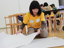 カレンダーのわく線をはり付けるのは、紙が大きいのでひと仕事。リーダーさんも大活やくでした。 - 【11.カレンダーづくりぁ