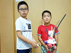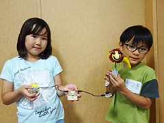 テーマは「夏のふしぎな生き物」。夏の生き物について聞いたら、みんなたくさんの生き物を教えてくれました。せいさくでは、アイディア出しから始めるグループ、素材(そざい)をさわるところから始めるグループ、プログラミングでまずはモーターを動かしてみるグループ、それぞれのグループのやり方で協力しながら作品を仕上げていきました。発表会では、ふしぎな生き物にみんな興味津々(きょうみしんしん)!ふしぎな動きや音が鳴る作品に、みんな笑顔でもり上がりました!